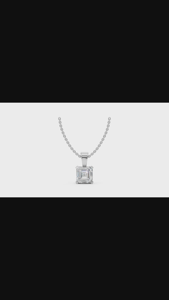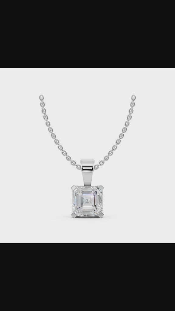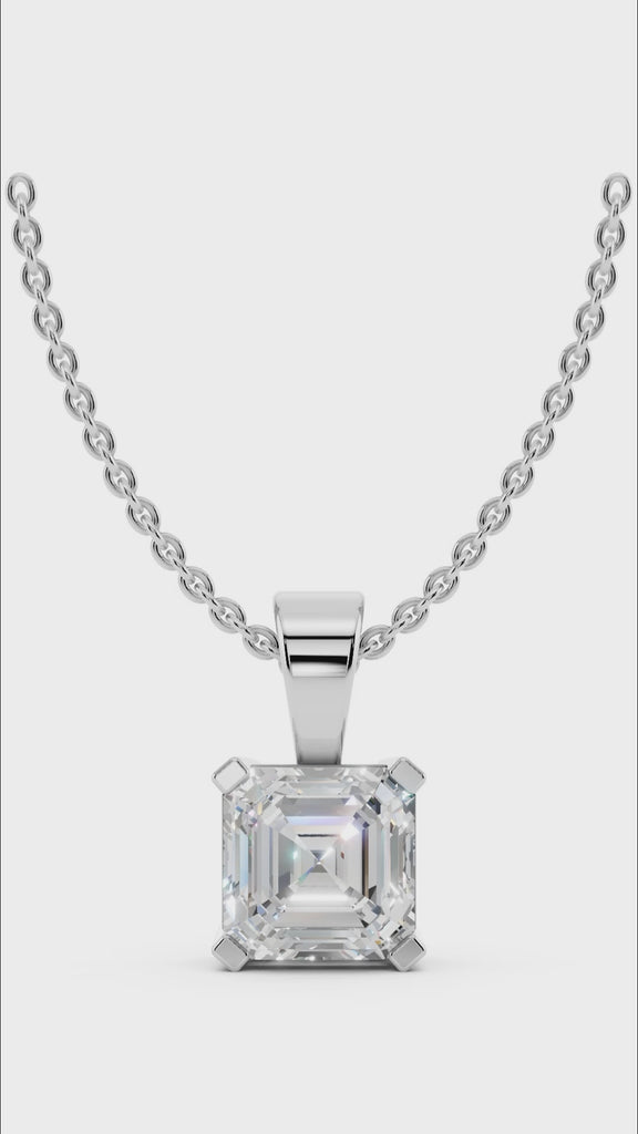 •Product Type: Solitaire Pendant & Chain •Metal: 925 Sterling Silver •Gemstone Type: Moissanite Diamond (Passes Standard Diamond Tester) •Diamond Weight: 2.5 Carats •Diamond Shape: Asscher •Diamond Size: 8mm x 8mm •Diamond Color: D-E-F •Diamond Clarity: VVS •Diamond Cut: Excellent •Diamond Polish: Excellent